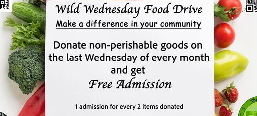 Wild Wednesday is back! Last Weds. of every month. Donate two non-perishable items or donate +$3 and earn free admission!